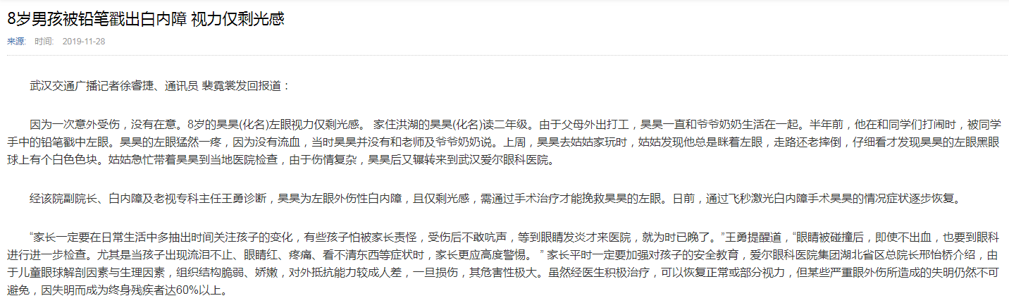 武汉交通广播记者徐睿捷、通讯员 裴霓裳发回报道: 因为一次意外受伤,没有在意。8岁的昊昊(化名)左眼视力仅剩光感。 家住洪湖的昊昊(化名)读二年级。由于父母外出打工,昊昊一直和爷爷奶奶生活在一起。半年前,他在和同学们打闹时,被同学手中的铅笔戳中左