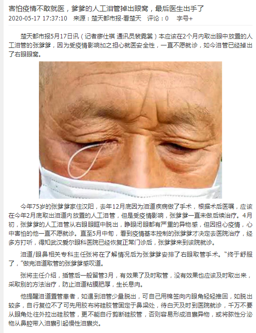 楚天都市报5月17日讯(记者廖仕祺 通讯员裴霓裳)本应该在2个月内取出眼中放置的人工泪管的张爹爹,因为受疫情影响加之担心就医安全性,一直不愿就诊,如今泪管已经掉出了右眼眼窝。 今年75岁的张爹爹家住汉阳,去年12月底因为泪道疾病做了手术,根据术后医嘱