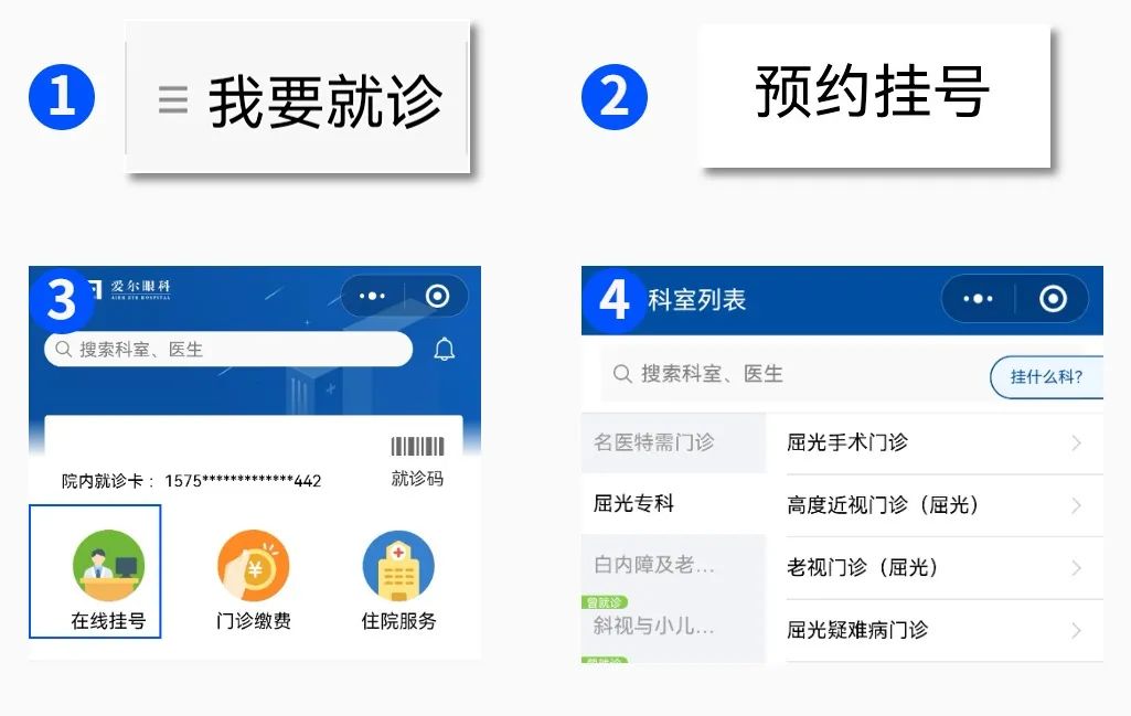 出门就医不方便 诊疗咨询困难 怎么办? 您只需要扫码进入“互联网医院”即可直接预约挂号缴费! 或者,还可关注 即可体验 专家在线接诊 初诊、复诊患者看病问诊 图片咨询、视频连线等 一部手机轻松搞定 互联网医院全新体验 智慧便捷、零接触、无风险 您还在等什么!!! 说约就约吧! 智慧医院入口 第一步:关注“武汉大学附属爱尔眼科医院(或武汉爱尔眼科医院)”公众号; 第二步:进入菜单栏【我要就诊】选择【预约挂号】; 第三步:点击首页【在线挂号】,可查看医院各科室及各科室开设的专病门诊,选择您所需的医生以及就诊时间; 第四步:如有任何疑问,可点击挂号界面右上角“挂什么科?”,进行线上咨询。 互联网医院入口 第一步:关注“武汉大学附属爱尔眼科医院(或武汉爱尔眼科医院)”公众号; 第二步:进入菜单栏【我要就诊】选择【互联网医院】即可跳转至爱尔眼科医院互联网医院界面; 第三步:点击首页【问诊购药】,可选择对应互联网医院在线医生,通过上传图文、视频问诊与医生交流病情。生成在线处方,通过处方快递相关治疗药物。 互联网医院/智慧医院能为您提供哪些服务? 1、专家线上问诊 关注武汉大学附属爱尔眼科医院(或武汉爱尔眼科医院)公众号,点击菜单栏【我要就诊】——【互联网医院】,即可跳转至爱尔眼科医院互联网医院界面。选择【问诊购药】, 可选择医生进行线上问诊。 2、线上开药、快递到家 关注武汉大学附属爱尔眼科医院(或武汉爱尔眼科医院)公众号,点击菜单栏 【我要就诊】——【互联网医院】,即可跳转至爱尔眼科医院互联网医院界面。选择【问诊购药】,根据医生开具处方后选择线上购药,快递到家。 3、线上预约挂号 关注武汉大学附属爱尔眼科医院(或武汉爱尔眼科医院)公众号,点击菜单栏 【我要就诊】——【预约挂号】,即可跳转至武汉大学附属爱尔眼科医院智慧医院界面,选择【在线挂号】。根据患者所需选择相应科室与医生,即可在线预约挂号。 4、门诊线上缴费 关注武汉大学附属爱尔眼科医院(或武汉爱尔眼科医院)公众号,点击菜单栏 【我要就诊】——【预约挂号】,即可跳转至武汉大学附属爱尔眼科医院智慧医院界面,选择【门诊缴费】。患者可选择自身需要缴费的门诊/住院项目,进行线上缴费。 5、眼健康科普 关注武汉大学附属爱尔眼科医院(或武汉爱尔眼科医院)公众号,点击菜单栏 【我要就诊】——【预约挂号】,即可跳转至武汉大学附属爱尔眼科医院智慧医院界面,选择【爱尔课堂】。 6、在线商城 关注武汉大学附属爱尔眼科医院(或武汉爱尔眼科医院)公众号,点击菜单栏 【我要就诊】——【在线商城】,即可跳转至武汉爱尔眼科e视光商城。可在线分类查找或直接输入商品名称进行选购,如润眼液、角膜塑形镜护理液、软性隐形接触镜等商品。