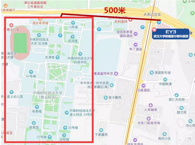 1、距离武汉大学附属爱尔眼科500米的中南财经政法大学首义校区内设有停车位。