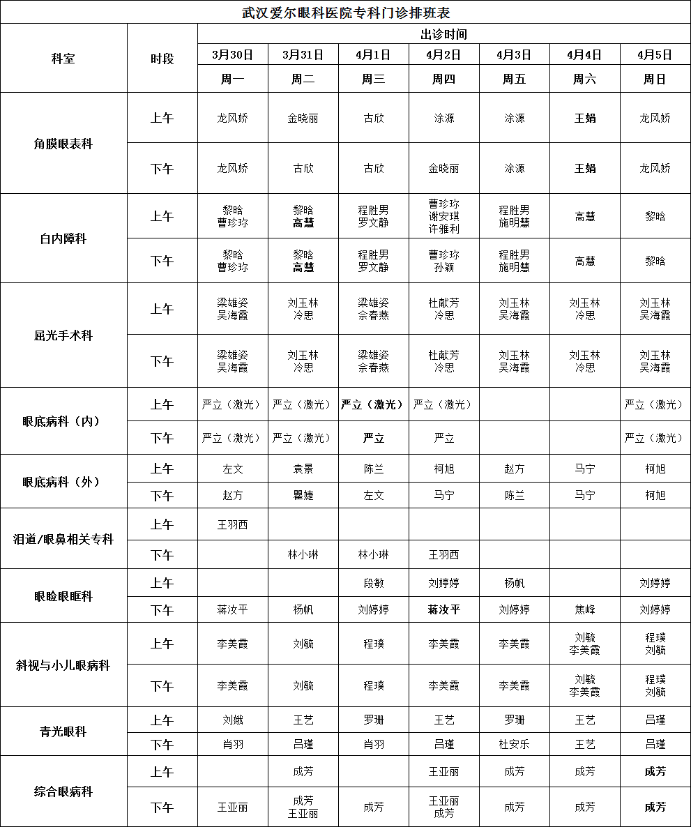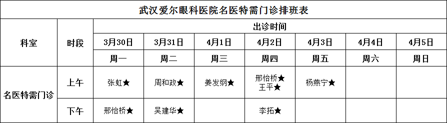 武汉大学附属爱尔眼科医院为无假日医院,具体坐诊安排请查看下方坐诊表。