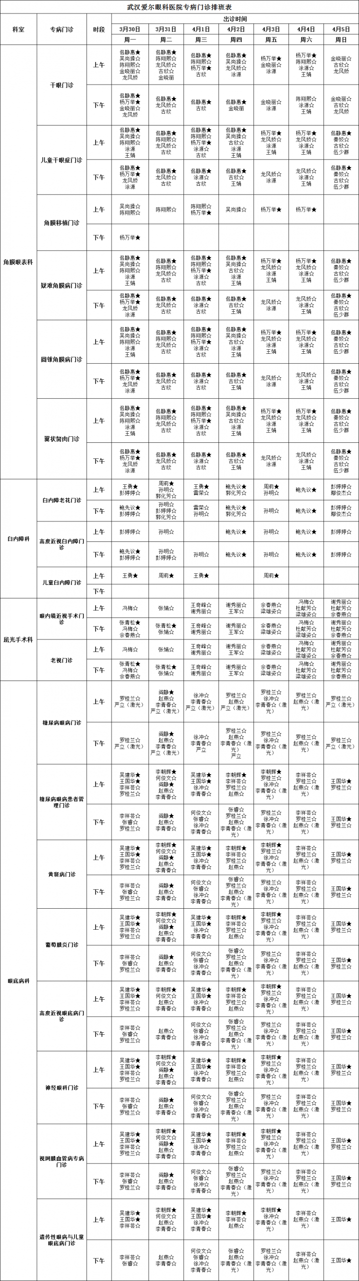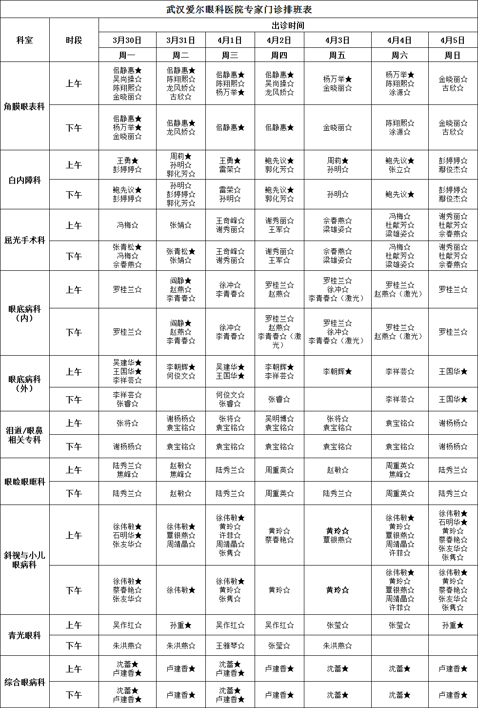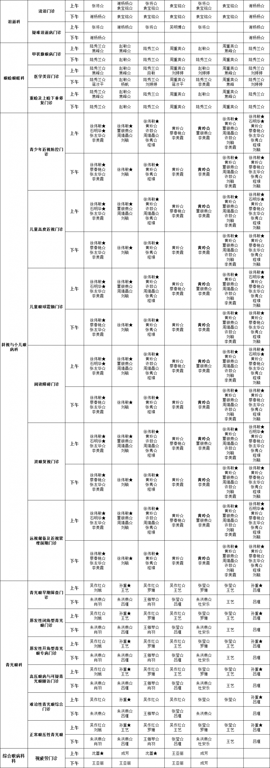 说明:★为主任医师或教授、☆为副主任医师或副教授、◆眼睑痉挛门诊、○为高度近视门诊、△为干眼门诊;□为老视门诊;●低视力门诊、◎飞蚊症门诊、Ø黄斑病门诊、₰角膜移植门诊、À圆锥角膜门诊;▲小儿泪道病门诊、◇泪道再通门诊、◆泪道重建门诊、※复发与修复门诊。还可能会临时有调整,比如某个专家会临时安排普通门诊惠及患者,实际坐诊医生请以当天医院排班为准。